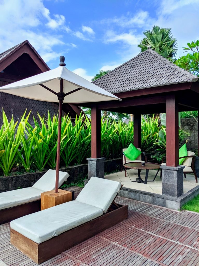 There is a separate wardrobe section which also has an in-room safety deposit box and a dressing area with lots of space for make-up and other things. The dressing area was accompanied with a chair and a neon colour cushion which made skin care and make-up time even more smooth. Lily Espresso coffee maker was available for a hot cuppa whenever required. A spot to cherish was the bathroom. Natural light falling in the area made it even more vivid. Next to the basins was the couple bathtub with bath salts and Balinese paintings all around, there was also a separate place for the toilet and shower, it had 2 big mirrors and two washbasins. The sight of the pool area from the big bathroom was amazing too. The whole villa was like a destination with so much to be explored. Private pool with couches to relax, a Gazebo with chairs and table to enjoy coffee/snacks anytime of the day! It was just so wonderful. The villa was surrounded by natural greenery coming from plants and trees.