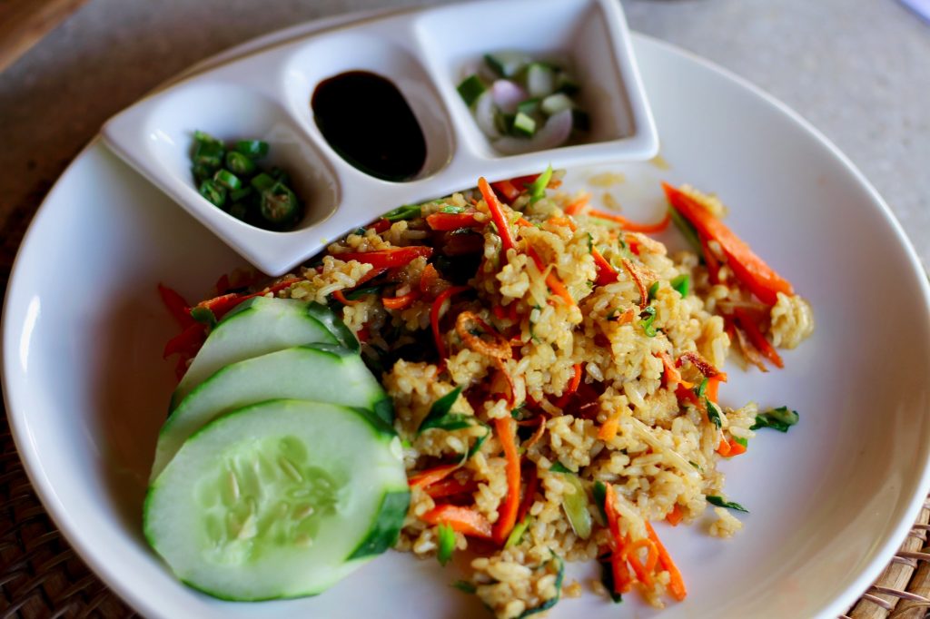 We were a family of 5 which means we could order a variety of versions. We ordered Nasi Goreng Bongkot in both the versions– veg and non-veg. The vegetarian version had cucumber slices and condiments while the non-veg version had fried eggs and chicken skewers. The dish was relished and finished in no time. It was so colorful, nice, tasty and different.